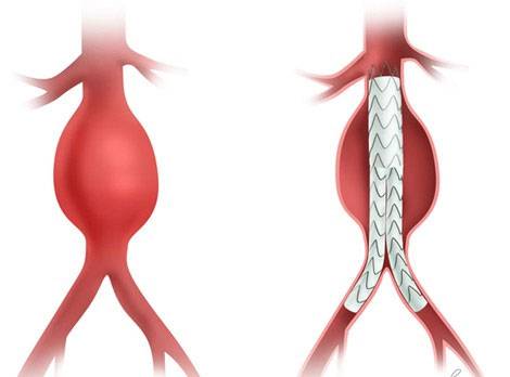 1) Kumaş kaplı stent (stent greft) yerleştirilerek anevrizma giderilebilir. Düz seyirli anevrizma genellikle bu şekilde tedavi edilir.