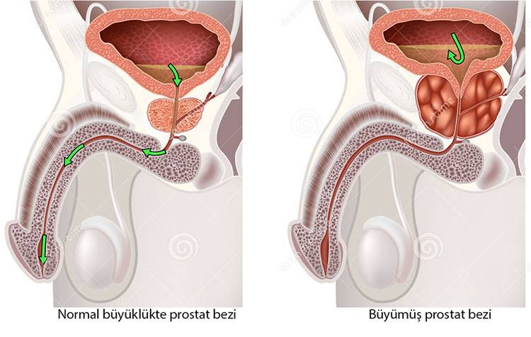 Normal prostat bezi mesanenin hemen altındadır. Mesanedeki idrar işeme ile atılır. İdrar kanalı prostat bezinin içinden geçerek kamışa ulaşır. Burada prostatta bir büyüme varsa idrarın rahat geçmesini engeller ve bu da idrar yapmada zorluk ve sık idrara çıkma gibi yakınmalar oluşmasına yol açar.