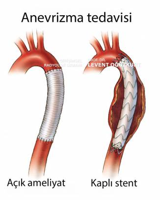 Aort anevrizmalarında standart tedavi yöntemi ameliyatla bu damarın değiştirilmesidir. Son 20 yılda gelişen ve gittikçe yaygınlaşan girişimsel tedavi işlemleri aort anevrizmaları için de geçerlidir. BU hastaların büyük bir kısmında ameliyat olmaksızın anjiyografi ile tedavi mümkündür. Bu yöntemde normal anjiyografi gibidir ancak damara girim deliği ve yerleştirilen stentler diğer damar stentlerine göre çok daha büyüktür. Kullanılan stentler normal stentlerden farklı olarak özel bir kumaş ile kaplıdır ve çok daha geniştir. Kullanılan kaplı stentlerin çapı normal damar çapı olan 3-4 cm civarındadır. Bazı merkezlerde damara girim için kasıkta küçük bir ameliyat yapılabilir. Ancak merkezimizde özel damara kapama cihazları kullanıldığı için bu küçük ameliyata dahi gerek yoktur. Tedavide amaç damarın genişlemiş bölgesine kaplı stentler konarak genişlemiş bölgeyi devre dışı bırakmak ve damarın yırtılmasını engellemektir.